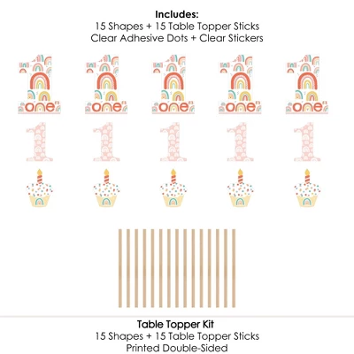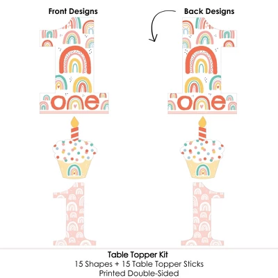 Hello Rainbow Centerpiece Sticks INCLUDES 15 Boho Rainbow table toppers in three different shapes, 15 sticks, and stickers for easy assembly. Boho Rainbow party table decorations are perfect for a 1st Birthday Party. Hello Rainbow Party Centerpiece Sticks SIZE 5 – Boho Rainbow shape 1 table toppers (7.75″ wide x 10.75″ tall), 5 – Boho Rainbow shape 2 table toppers (5″ wide x 7″ tall), and 5 – Boho Rainbow shape 3 table toppers (4.75″ wide x 7″ tall). The unique design and variety of pieces makes this table decoration kit an impressive addition to any Boho Rainbow theme party. EASY PARTY DECOR: Hello Rainbow table decorations can be used as centerpieces when attached to the included sticks and inserted into vases or floral arrangements. They easily accent your First Birthday Party candy buffet when you add them to apothecary jars. Table toppers are also a great addition to any photo booth. The large, shaped cut outs will make your party pics instantly shareable. Boho Rainbow party centerpiece sticks are sure to make a statement however you choose to use them! PREMIUM PARTY SUPPLIES: Hello Rainbow party table toppers are professionally printed on heavy-duty cardstock paper with a photo-like shine. They are individually inspected and carefully packaged by hand with sticks and stickers for easy assembly. Get creative with your DIY party ideas! MADE IN THE USA: Hello Rainbow – Party Centerpiece Sticks are designed and manufactured at our Wisconsin facility using materials that are Made in America.