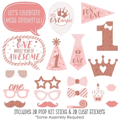 20-Piece First Birthday Party Photo Booth Props Kit INCLUDES 20 1st Birthday Little Miss Onederful photo booth props, 20 sticks and stickers for assembly. EASY ASSEMBLY: Simply attach the printed DIY photo booth props to the sticks with included reinforcing stickers. PERFECT FOR ANY CROWD! Photo booth props are fun first birthday party supplies for adults and kids – everyone will love the funny faces on these 1st Birthday Little Miss Onederful party photo booth props. Take entertaining and shareable party photos of your friends and family while making memories with these funny photo booth props! FIRST BIRTHDAY PARTY DECORATIONS: There are many fun ways to use these cute photo booth props! Use as intended at home, school or work and take party photos to share; add them to vases and floral arrangements as a fun bday party centerpiece; or accent your first birthday buffet by displaying them in apothecary candy jars! HIGH-QUALITY PARTY SUPPLIES: 1st Birthday Little Miss Onederful photo booth props are professionally printed on thick cardstock paper. They will arrive cut out and ready to assemble with the included sticks and stickers. Girl First photo booth props use a No-Mess Glitter Print: Our photo booth props are designed with a printed image of glitter, eliminating glitter flake while maximizing bling effect! MADE IN THE USA: 1st Birthday Little Miss Onederful – Party Photo Booth Props Kit is designed and manufactured at our Wisconsin facility using materials that are Made in America.
