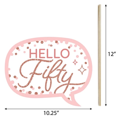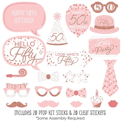 20-Piece Girl Birthday Party Photo Booth Props Kit INCLUDES 20 50th Pink Rose Gold Birthday photo booth props, 20 sticks and stickers for assembly. EASY ASSEMBLY: Simply attach the printed DIY photo booth props to the sticks with included reinforcing stickers. PERFECT FOR ANY CROWD! Photo booth props are fun party supplies for adults and kids – everyone will love these 50th Pink Rose Gold Birthday photo booth props. Take entertaining and shareable party photos of your friends and family while making memories with these fun photo booth props! PRETTY PINK AND ROSE GOLD PARTY DECORATIONS: There are many fun ways to use these cute photo booth props! Use as intended at home, school or work and take party photos to share; add them to vases and floral arrangements as a fun Girl Birthday Party centerpiece; or accent your Hello Fifty Birthday Girl candy buffet by displaying them in apothecary candy jars! HIGH-QUALITY PARTY SUPPLIES: 50th Pink Rose Gold Birthday photo booth props are professionally printed on thick cardstock paper. They will arrive cut out and ready to assemble with the included sticks and stickers. MADE IN THE USA: 50th Pink Rose Gold Birthday – Girl Birthday Party Photo Booth Props Kit is designed and manufactured at our Wisconsin facility using materials that are Made in America. 50th Pink Rose Gold Birthday photo booth props use a No-Mess Glitter Print: Our photo booth props are designed with a printed image of glitter, eliminating glitter flake while maximizing bling effect!