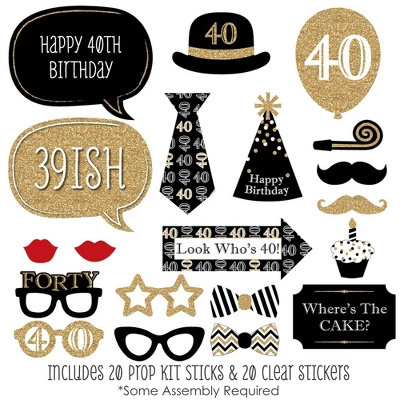 20-Piece Black and Gold Photo Booth Props Kit INCLUDES 20 Adult 40th Birthday photo booth props, 20 sticks and adhesives for assembly. EASY ASSEMBLY: Simply attach the printed DIY photo booth props to the sticks with included adhesive and reinforcing stickers. PERFECT FOR ANY CROWD! Photo booth props are fun birthday party supplies for adults and kids – everyone will love the funny faces on these Adult 40th Birthday photo booth props. Take entertaining and shareable party photos of your friends and family while making memories with these stylish photo booth props! BIRTHDAY PARTY DECORATION IDEAS: There are many fun ways to use these cute photo booth props! Use as intended at home, school or work and take party photos to share; add them to vases and floral arrangements as a fun black and gold centerpiece; or accent your fortieth birthday theme by displaying them in decorative candy jars! HIGH-QUALITY PARTY SUPPLIES: Adult 40th Birthday – Gold photo booth props are professionally printed on thick cardstock paper. They will arrive cut out and ready to assemble with the included sticks and adhesives. Adult 40th Birthday – Gold photo booth props use a No-Mess Glitter Print: Our photo booth props are designed with a printed image of glitter, eliminating glitter flake while maximizing bling effect! MADE IN THE USA: Adult 40th Birthday – Gold – Photo Booth Props Kit is designed and manufactured at our Wisconsin facility using materials that are Made in the USA.