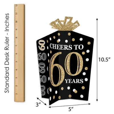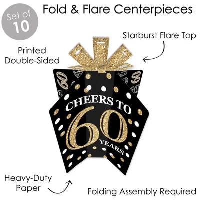 Adult 60th Birthday – Gold Fold and Flare Centerpieces INCLUDE: 10 heavy-duty paper centerpieces in our Adult 60th Birthday – Gold theme. Each centerpiece has art on all four sides and starburst top for an impressive display. Some simple folding assembly required. EASY TABLE DECOR: Each Adult 60th Birthday – Gold centerpiece SIZE 5 inches wide (front/back) x 3 inches wide (sides) x 10.5 inches tall. This 10 count table decorations set requires easy folding to flare out each centerpiece at your desired look. Easy DIY folding assembly: Use a flat surface to fold along the scored creases to stand the centerpiece upright and be able to balance on its own. PARTY CENTERPIECES: Style your birthday party with Adult 60th Birthday – Gold table centerpiece decorations. Place in the center of multiple tables or add to all areas of the party such as welcome entrance, gift table, or dessert buffet for an extra flair. HIGH-QUALITY PARTY SUPPLIES: Adult 60th Birthday – Gold fold and flare centerpieces are professionally printed double-sided on sturdy cardstock paper with a photo-like shine. They are individually inspected and carefully packaged by hand. Fold and flare centerpieces will arrive flat, with easy folding required for quick assembly. MADE IN THE USA: Adult 60th Birthday – Gold fold and flare centerpieces are designed and manufactured at our Wisconsin facility using materials that are Made in the USA. Adult 60th Birthday – Gold table centerpieces use a No-Mess Glitter Print: Our table decorations are designed with a printed image of glitter, eliminating glitter flake while maximizing bling effect!
