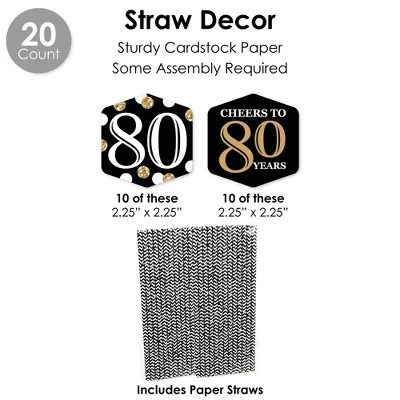 DIY WRAPPERS includes: 20 total reversible wrappers that are 10.75″ wide x 2″ tall. When wrapped, they can accommodate favors 1.75″ to 2.5″ in diameter. Professionally printed double-sided on sturdy cardstock paper, these wrappers for a Birthday Celebration are easy to secure on a variety of items like beverage containers, vases, napkins, and more by wrapping around and sliding the tab into the appropriate slit. CUPCAKE WRAPPERS includes: 20 adjustable cupcake wrappers 1.75″ – 2.5″ wide x 1.75″ tall. Professionally printed double-sided on sturdy cardstock paper, Adult 80th Birthday cupcake wrappers will fit over cupcake liners on standard and medium-sized cupcakes and are reversible for a coordinated look. Secure cupcake wrappers by sliding the tab into appropriate slit. TREAT PICKS includes: 20 cut-outs 2″ wide x 2.25″ tall & clear treat picks 4″ tall. Gold paper cut-outs come in 2 designs. Assembly stickers are included for easy DIY required assembly. FAVOR GIFT TAGS includes: 20 gift tags 3.5″ wide by 2.75″ tall & satin ribbon. Professionally printed double-sided on sturdy cardstock paper, write a special message on the back side of Adult 80th Birthday gift tags for a personal touch then attach to favors with ribbon. STRAW DECOR includes 20 cut-outs with 2 designs10 of each, size 2.25″ wide by 2.25″ tall and chevron striped paper straws – 7.75″ tall. Shaped cut-outs are professionally printed on sturdy cardstock paper. For easy assembly, create your stylish drinks by attaching Gold shaped cut-outs to paper straws with clear stickers included. Favor party pack is designed and manufactured at our Wisconsin facility using materials that are Made in the USA. Adult 80th Birthday favor pack uses a No-Mess Glitter Print: Our party kits are designed with a printed image of glitter, eliminating glitter flake while maximizing bling effect!