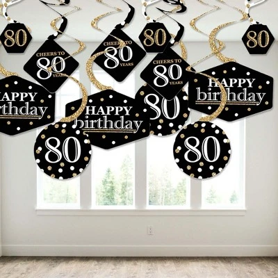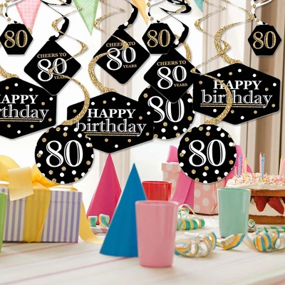 Party Decoration Swirls – Set of 40 INCLUDES 4 different shapes, 10 count per shape, that hang below an accordion-style spiral with included clear hooks. 10 swirls SIZE 5 inches x 5 inches with length about 11 inches. 10 swirls, SIZE 7.75 inches x 5.5 inches with length about 9 inches. 10 swirls, SIZE 5 inches x 4.75 inches with length about 4 inches. 10 swirls, SIZE 3 inches x 2.75 inches with length about 3.5 inches. PERFECT FOR ANY EVENT: With different hanging lengths and a variety of shapes and sizes, Party Decoration Swirls are perfect for birthday parties. Add a pop of color when displayed over the gift table or dessert buffet. Or, add your own string if you would like them to hang lower in your party space. EASY TO USE: Each decoration swirl in the 40-piece set has a pre-cut hole for easy assembly using the included clear hooks. Party decoration swirls will arrive flat. Take a clear hook and insert the bottom bar into the pre-cut hole. Once the clear hook is fastened, gently stretch the swirl and hang it up. HIGH-QUALITY PARTY SUPPLY: Adult 80th Birthday – Gold Party Decoration Swirls are professionally printed and double-sided on heavy-duty cardstock paper. They are individually cut, inspected, and carefully packaged. Each swirl will use one clear hook. MADE IN THE USA: Party Decoration Swirls are designed and manufactured at our Wisconsin facility using materials that are Made in the USA. Adult 80th Birthday – Gold Party Decoration Swirls uses a No-Mess Glitter Print: Our party kits are designed with a printed image of glitter, eliminating glitter flake while maximizing bling effect!