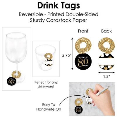 Paper Chargers: Includes 8 scalloped-edge table decorations that are the perfect base for your meal plates. Each place setting charger measures 11.25” in diameter and is a great substitute for a paper doily. They come with a scallop border that can be flared up for an elevated look. Professionally printed double-sided on sturdy cardstock paper, paper chargers are reversible for an alternate look. Napkin Rings: Includes 8 DIY1st Adult 80th Birthday paper napkin rings with tassel-shaped ends. Professionally printed double-sided on sturdy cardstock paper, each napkin ring holder is reversible and measures 2.25” wide by 2.25” tall when assembled. To use, carefully curve each ring without creasing and connect by interlocking the tassel-shaped ends together. Black & Gold Drink Tags: Includes 8 paper drink charms that are perfect for accessorizing your drinkware. Each beverage tag is professionally printed double-sided on sturdy cardstock paper with space on the backside for handwritten personalization. Drink tags measure 1.5” wide by 2.75” and will look great on the stem of a glass or on the rim of your cup. Place Cards: Includes 81st Adult 80th Birthday name cards that are professionally printed double-sided on sturdy cardstock paper and measure 3.5” wide by 2.5” tall when assembled. To use, push back the top outer edge, revealing the half-circle top. Fold along the pre-scored line in the center to create the tent shape, and then display! Paper Coasters: Includes 8 Black & Gold Themed reversible circles that perfectly highlight your drinkware. Each beverage coaster is professionally printed double-sided on sturdy cardstock paper and measures 4” in diameter.