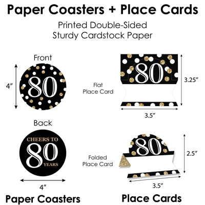 - Paper Coasters: Includes 8 drink circles that measure 4” in diameter. Design Reads: “80”