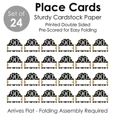 Adult 90th Birthday Place Cards INCLUDES 24 individual cards that measure 3.5” wide x 2.5” tall when assembled. Easy to use, these tabletop accents are perfect to use at your next Birthday Party. VERSATILE IN USE: Whether it’s a small party or large gathering, the Black & Gold Place Cards can be used in a variety of ways. Handwrite words in the blank space and then set them on the buffet table, as part of a place setting, or consider using them for an icebreaker activity. EYE-CATCHING DESIGN: Featuring crisp graphics with an innovative cut design, Adult 90th Birthday Place Cards will easily draw in attention without taking up too much space. To assemble, push back the top outer edge, revealing the half-circle top. Fold along the pre-scored line in the center to create the tent shape, and then display! HIGH-QUALITY: Black and Gold Place Cards are professionally printed double-sided on sturdy cardstock paper with a photo-like shine. They are individually inspected and carefully packaged by hand. Place Cards will arrive flat with some folding assembly required. MADE IN THE USA: Adult 90th Birthday Place Cards are designed and manufactured at our Wisconsin facility using materials that are Made in the USA. Place Cards uses a No-Mess Glitter Print: Our Place Cards are designed with a printed image of glitter, eliminating glitter flake while maximizing bling effect!