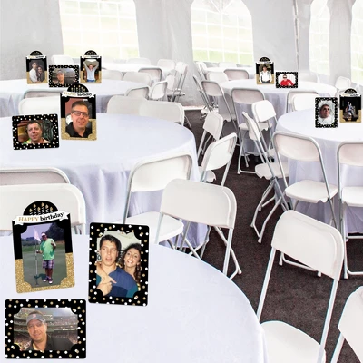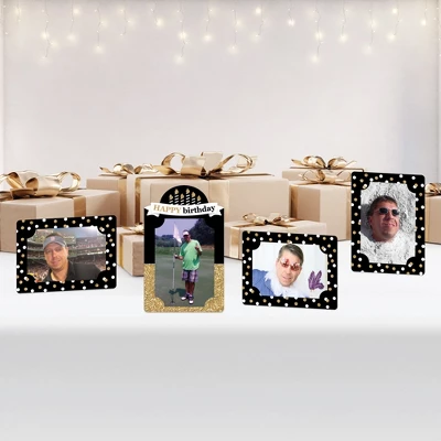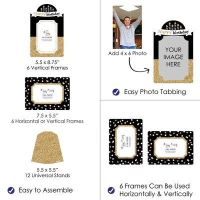 Adult Happy Birthday – Gold Paper Photo Frames includes a set of 12 picture frames with stand that are suitable for 4×6 photographs. Six vertical frames come with a round shaped top and the other six frames come in a standard rectangular shape that can be displayed horizontally or vertically. Decorative Display: Show off your guest of honor’s photos with the Adult Happy Birthday – Gold paper frames. Paper photo frames are perfect for displaying pictures on bookshelves, welcome tables, tablescape centerpieces, and fireplace mantel decorations. Easy Assembly: Attach the stand to the frame by inserting the tabs into corresponding slots. Next, fold the sides of the stand towards the center and fold down the support piece of the stand until it rests in the notches. Finally, secure your photos using the corner tabs! High-Quality Supply: Adult Happy Birthday – Gold paper frames are professionally printed double-sided on heavy-duty cardstock paper with a photo-like shine. Frame with round top measures 5.5 inches wide by 8.75 inches tall. Standard rectangle frame measures 7.5 inches wide by 5.5 inches tall. Each stand measures 5.5 inches wide by 5.5 inches tall. Made In The USA: Adult Happy Birthday – Gold Paper Photo Frames are designed and manufactured at our Wisconsin facility using materials that are Made in the USA. Adult Happy Birthday – Gold Paper Frames uses a No-Mess Glitter Print: Our Frames are designed with a printed image of glitter, eliminating glitter flake while maximizing bling effect!