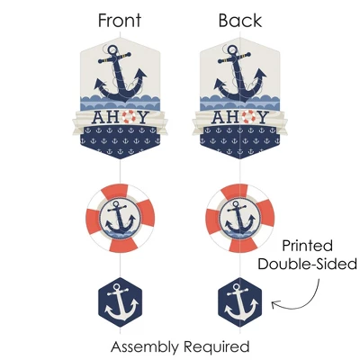Ahoy – Nautical Hanging Vertical Decorations INCLUDE 30 shaped pieces, 1 roll clear cording, and assembly stickers. Ahoy – Nautical Vertical Decorations are fun and versatile party danglers for your next Baby Shower or Birthday Party. ROOMERIFIC: Ahoy – Nautical Hanging Vertical Decorations can be displayed at any lengths you choose and make an attractive backdrop for your next Baby Shower or Birthday Party. Shaped pieces come in 3 sizes of 10 each, with the following specifications: 10 at 8.5 x 11 inches, 10 at 6.25 x 6.25 inches, and 10 at 4 x 4.5 inches. Hang near a wall to capture fun group photos, or place throughout the room to create a unified theme. They look amazing when coordinated above gift and buffet tables. DIY DONE RIGHT: Get ready for guests in a snap with this colorful, easy-to-assemble, 30-piece Ahoy – Nautical Hanging Party Decorations kit. Printed double-sided, each shaped piece includes top and bottom tabs for easy hanging. Simply interlock clear cording into each piece and secure with provided clear stickers. HIGH-QUALITY DECOR: Ahoy – Nautical Hanging Vertical Decorations are professionally printed on heavy-duty cardstock paper. Each piece is individually inspected and carefully packaged by hand. Requires some simple do-it-yourself assembly. Use provided clear cording to display decorations however you prefer. MADE IN THE USA: Ahoy – Nautical Hanging Vertical Decorations are designed and manufactured at our Wisconsin facility using materials that are Made in the USA.