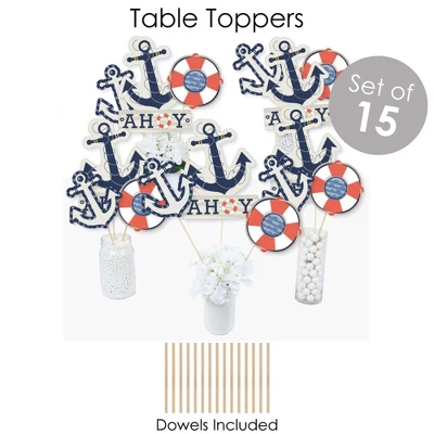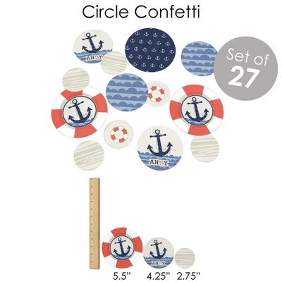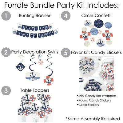 BUNTING BANNER includes: letter and themed pennants. Each pennant measures 8.5″ high x 5.5″ wide. Pennants are numbered in sequence and ribbon is included for easy assembly. PARTY DECORATION SWIRLS includes: 4 different shapes, 10 count per shape, that hang below an accordion-style spiral. Professionally printed double-sided, each decoration swirl in the 40-piece set has a pre-cut hole for easy assembly using the included clear hooks. Party decoration swirls will arrive flat. TABLE TOPPERS includes: 15 nautical centerpiece sticks in three different shapes, each professionally printed double-sided. To use as centerpieces or photo props, wooden dowels and assembly stickers are included. CIRCLE CONFETTI includes: three different sizes of circles – 12 small circles, size 2.75″, 9 medium circles, size 4.25″, and 6 large circles, size 5.5″. Professionally printed double-sided with coordinating nautical designs, circle confetti can be scattered around your table. FAVOR KIT: CANDY STICKERS includes: 2 sheets mini candy bar wrappers (total 40), 2 sheets round candy stickers (total 216), 2 sheets circle stickers (total 48). Easy assembly with this peel and stick favor kit. Simply center and press stickers onto your favorite candies to style candy buffets or decorate take-home favors for party guests. Note: Candy is not included.