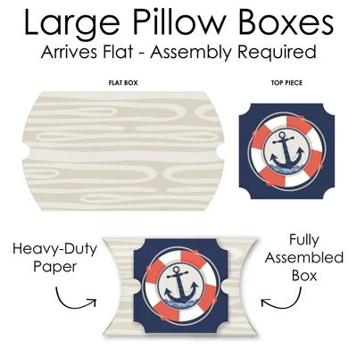 Ahoy – Nautical Large Pillow Boxes INCLUDES 12 boxes and 12 decorative top pieces. Boxes arrive flat and require some easy assembly. These Anchor favor gift boxes make great giveaways at your next Baby Shower or Birthday Party. BOX-ERRIFIC: Ahoy – Nautical Large Pillow Boxes are SIZE 7 inches long x 4.5 inches wide. Fully assembled boxes have a 1.75-inch-wide opening on both ends and are 5 inches deep for storing items inside. Made of heavy-duty, these loot favor gift boxes can be filled with wrapped treats, trinkets, or small mementos; boxes are suitable for all ages. These boxes are fun and artful, making them perfect accents at any party table setting. EASY ASSEMBLY: Anchor Large Pillow Boxes require some assembly before use. Start by securing a top piece to a pillow box by tucking top piece under both tabs on box. Gently squeeze box open and fold ends down in numerical order. NOTE: Top pieces can be displayed horizontally or vertically on boxes. PREMIUM FAVOR BOXES: Ahoy – Nautical Large Pillow Boxes are professionally printed on heavy-duty paper with a photo-like shine. The ends have full overlapping flaps; no tape or extra materials needed. They are individually inspected and carefully packaged. Treats, trinkets, and small mementos not included. MADE IN THE USA: Ahoy – Nautical Large Pillow Boxes are designed and manufactured at our Wisconsin facility using materials that are Made in the USA.