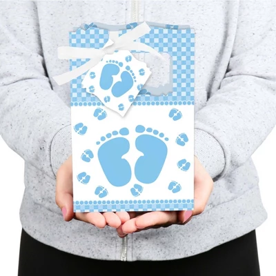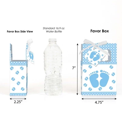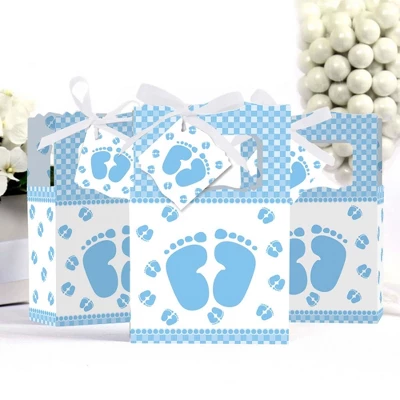 Baby Feet Blue Favor Boxes INCLUDES 12 blue baby feet party favor bags, 12 gift tags and coordinating satin ribbon. Classic favor boxes are a party must-have. Boy baby feet theme party supplies are great for a baby shower. Baby Feet Blue Party Favor Boxes SIZE 4.75 inches wide x 4.75 inches high x 2.25 inches deep (fillable inside space) with a total height of 7 inches, including the handle. The coordinating gift tags and ribbon makes these 12 blue baby feet party favor boxes a complete treat bag party kit that everyone will love. PARTY SUPPLIES: Baby shower party favor boxes will hold a variety of treats, prizes and party favors for your guests. Fill them with baked goodies, party trinkets or thank you gifts for adorable Baby Feet Blue party favors! PREMIUM PARTY FAVOR BOXES: Baby Feet Blue party favor boxes are professionally printed on heavy-duty cardstock paper with a photo-like shine. They are hand-folded and individually inspected, then carefully packaged. Favor boxes will arrive flat, partially assembled. Finishing assembly is required but it is easy. Once assembled, add the blue baby feet gift tag with the included ribbon for perfect party favors! MADE IN AMERICA: Baby Feet Blue – Baby Shower Party Favor Boxes are designed and manufactured at our Wisconsin facility using materials that are Made in America.