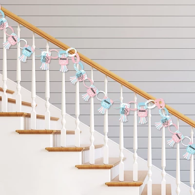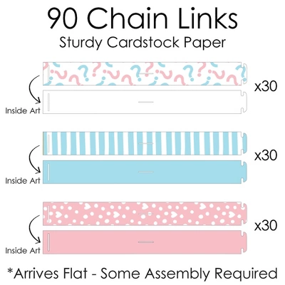 Paper Chains Garland INCLUDES: 90 paper chain links in 3 coordinating patterns and 30 paper tassels in 3 coordinating patterns. Completed paper chains garland measures approximately 21 feet, with some assembly required. One chain link SIZE 10 inches x 1 inch and one paper tassel SIZE 3 inches x 5.5 inches. SIMPLE ASSEMBLY: Baby Gender Reveal paper chain decoration kit will arrive flat and is easy enough for the whole family to assemble. First, form a chain link into a circle and insert the tab through the slit. Slide the next chain link through the first link and repeat until all chain links are connected, forming a paper chains garland. Attach paper tassels by inserting paper tassel through center slit located on the chain link. DIY PARTY SUPPLIES: Dress up all areas with Blue & Pink paper chains. Some fun decorating ideas are to wrap paper chains down a staircase railing, hang above doorways, or use as a photo booth backdrop. For an effortless look, stretch paper chains garland down the center of your dining room table. Paper chains can also be used to count down the days to a big event or trip. PREMIUM PARTY DECORATION: Paper chain decorations are professionally printed and double-sided on sturdy cardstock paper, with a photo-like shine. They are then individually cut, inspected, and carefully packaged. Baby Gender Reveal paper chains garland is a DIY kit that can be used in many ways. Get inspired with this fun do-it-yourself He or She Baby Shower Party decor kit! MADE IN THE USA: Baby Gender Reveal paper chains garland is designed and manufactured at our Wisconsin facility using materials that are Made in the USA.