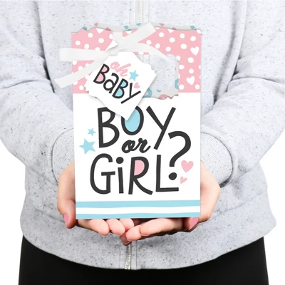 Baby Gender Reveal Favor Boxes INCLUDES 12 Blue & Pink party favor Boxes, 12 gift tags, and coordinating satin ribbon. Classic favor boxes are a party must-have. Blue & Pink theme party supplies are great for a He or She Baby Shower Party. Baby Gender Reveal Party Favor Boxes SIZE 4.75 inches wide x 4.75 inches high x 2.25 inches deep (fillable inside space) with a total height of 7 inches, including the handle. The coordinating gift tags, and ribbon makes these 12 Blue & Pink party favor boxes a complete treat box party kit that everyone will love. BLUE & PINK PARTY SUPPLIES: Pregnancy Announcement Party favor boxes will hold a variety of treats, prizes and party favors for your guests. Fill them with baked goodies, party trinkets or thank you gifts for adorable Baby Gender Reveal party favors! PREMIUM PARTY FAVOR BOXES: Baby Gender Reveal party favor boxes are professionally printed on heavy-duty cardstock paper with a photo-like shine. They are hand-folded and individually inspected, then carefully packaged. Favor boxes will arrive flat, partially assembled. Finishing assembly is required but it is easy. Once assembled, add the Baby Gender Reveal gift tag with the included ribbon for perfect party favors! MADE IN AMERICA: Baby Gender Reveal He or She Baby Shower Party Favor Boxes are designed and manufactured at our Wisconsin facility.