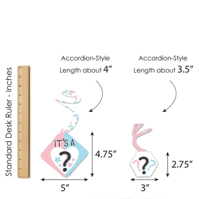 Baby Gender Reveal Party Decoration Swirls – Set of 40 INCLUDES 4 different shapes, 10 count per shape, that hang below an accordion-style spiral with included clear hooks. 10 swirls SIZE 5 inches x 5 inches with length about 11 inches. 10 swirls, SIZE 7.75 inches x 5.5 inches with length about 9 inches. 10 swirls, SIZE 5 inches x 4.75 inches with length about 4 inches. 10 swirls, SIZE 3 inches x 2.75 inches with length about 3.5 inches. PERFECT FOR ANY EVENT: With different hanging lengths and a variety of shapes and sizes, Party Decoration Swirls are perfect for any Blue & Pink Party. Add a pop of color when displayed over the gift table or dessert buffet. Or, add your own string if you would like them to hang lower in your party space. EASY TO USE: Each decoration swirl in the 40-piece set has a pre-cut hole for easy assembly using the included clear hooks. Party decoration swirls will arrive flat. Take a clear hook and insert the bottom bar into the pre-cut hole. Once the clear hook is fastened, gently stretch the swirl and hang it up. HIGH-QUALITY PARTY SUPPLY: Baby Gender Reveal Decoration Swirls are professionally printed and double-sided on heavy-duty cardstock paper. They are individually cut, inspected, and carefully packaged. Each swirl will use one clear hook. MADE IN THE USA: He or She Baby Shower Party Decoration Swirls are designed and manufactured at our Wisconsin facility using materials that are Made in the USA.