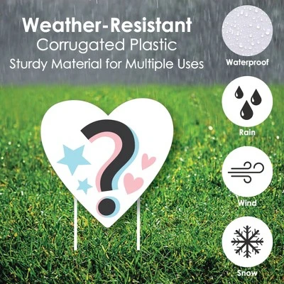 Pregnancy Announcement Party Lawn Decorations INCLUDES: 8 coordinating Big dot of Happiness Baby Gender Reveal yard decorations: 1 – Large “Boy or Girl” Shape, 7 – Small Blue & Pink Shapes, and 16 stakes for displaying. Easy assembly instructions are also included. PERFECT FOR ANY LOCATION! Baby Gender Reveal Yard Signs SIZE: Large “Boy or Girl” Shape 1 (22.25″ x 16.75″), 2 – “Team Boy” Shape 2 (10.75” x 9.25”), 2 – “Team Girl” Shape 3 (10.75” x 9.25”), and 3 “?” Heart Shape 4 (9.5” x 9.25”). Blue & Pink yard decor is an easy way to decorate for your Team Boy or Team Girl Party. Both adults and kids will love these Baby Gender Reveal party supplies. EASY TO USE: Baby Gender Reveal Yard Sign & Outdoor Lawn Decorations are professionally printed and cut, making assembly quick and easy. Simply insert two heavy-duty stakes into each Blue & Pink yard ornament and press into the ground to display. HIGH-QUALITY YARD DECORATIONS: Blue & Pink Yard Signs are professionally printed on durable, corrugated plastic. 8-Piece yard decorations are waterproof and can be used outdoors. Baby Gender Reveal lawn decor can be displayed in wind, snow, and rain without any worry. MADE IN THE USA: Baby Gender Reveal Yard Sign & Outdoor Lawn Decorations are designed and manufactured at our Wisconsin facility using materials that are Made in the USA.