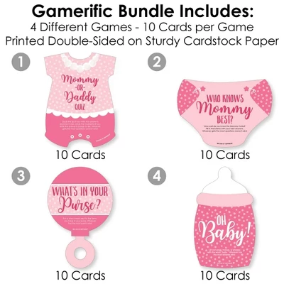 Baby Girl Gamerific Bundle INCLUDES 4 baby shower games with 10 game cards per each game. BABY SHOWER GAMES: Guests will have fun playing 4 different baby shower games: Mommy or Daddy Quiz, Who Knows Mommy Best, What’s in Your Purse, and Oh Baby! Each game is shaped like popular baby items: baby bodysuit, diaper, baby rattle, and baby bottle. HOW TO PLAY: Each game card is printed with easy-to-follow game instructions. For added fun, make each game extra competitive by adding a time limit and offering a prize to the winning party guest. HIGH-QUALITY: Baby Girl Baby Shower Games are professionally printed and double-sided on sturdy cardstock paper. They are individually inspected and carefully packaged by hand. This fun baby shower game set will arrive ready to play. MADE IN THE USA: Baby Girl Baby Shower Gamerific Bundle is designed and manufactured at our Wisconsin facility using materials that are Made in the USA.