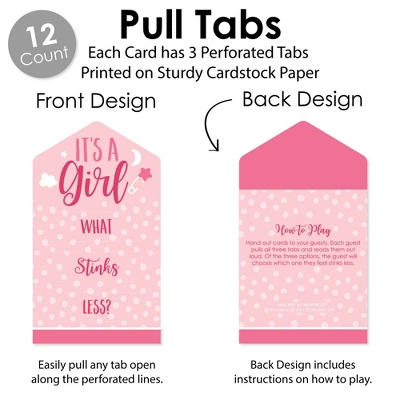 Baby Girl Conversation Starters Pull Tabs INCLUDES 12 pull tab game cards that are suitable for a Baby Shower. Each card comes with 3 tabs to choose from and instructions on the back. BREAK THE ICE: Entertaining for all! The Baby Girl Conversation Starters pickle cards are excellent to ease the mood and use as an icebreaker. Trade cards with others and open a new tab for more entertainment! HOW TO PLAY: Hand out one pull tabs game card to each player. Players will select one tab and easily pull it open along the perforated lines. Share the prompts out loud for some good fun. HIGH-QUALITY: Baby Girl Conversation Starters Pull Tabs are professionally printed double-sided on sturdy cardstock paper with a photo-like shine. They are individually inspected and carefully packaged by hand. MADE IN THE USA: Baby Girl Pull Tabs Game is designed and manufactured at our Wisconsin facility using materials that are Made in the USA.