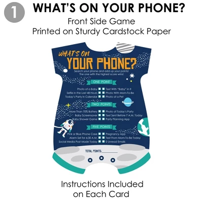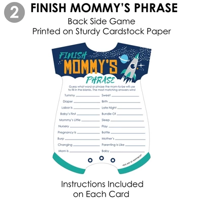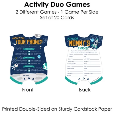 Big Dot of Happiness Blast Off to Outer Space Activity Duo Games INCLUDES set of 20 Rocket Ship Baby Shower activity cards. Each card comes with 2 different games – 1 game per side. Instructions and answer keys included on each card. Festive Fun: Add some entertainment to your celebration when you pass out the 2-in-1 Blast Off to Outer Space activity cards. Each card is easy to handwrite on and features games What’s On Your Phone? and Finish Mommy’s Phrase. How To Play: Each game card is printed with easy-to-follow game instructions and requires a pen or pencil. For added fun, make each game competitive by adding a time limit and offering a prize to the winning party guest. High-Quality Supply: Blast Off to Outer Space cards are professionally printed double-sided on heavy-duty cardstock paper with a photo-like shine. Each Baby Body Suit-shaped card measures 5″ wide by 6.75″ tall. This game set will arrive ready to play. Made In The USA: Blast Off to Outer Space Activity Duo Games are designed and manufactured at our Wisconsin facility using materials that are Made in the USA.