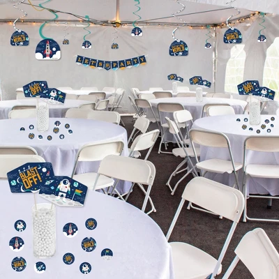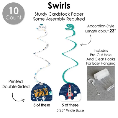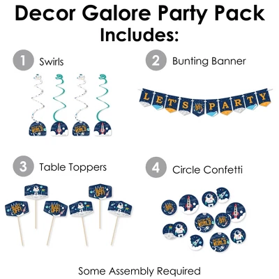 SWIRLS includes: 10 total swirls with 2 designs – 5 count per design, that hang with an accordion-style spiral. Professionally printed double-sided, the Blast Off to Outer Space decoration swirls come with a 5.25” wide base and a spiral length of about 23” long. Each decoration swirl comes with a pre-cut hole and clear hooks for easy assembly. BUNTING BANNER includes: letter and themed pennants, perfect for your Rocket Ship Baby Shower or Birthday Party. Each pennant measures 5” wide x 7.25” tall. Pennants are numbered in sequence and ribbon is included for easy assembly. TABLE TOPPERS includes: 10 centerpiece sticks that come with two shape cut-out designs, each professionally printed double-sided. The centerpiece shapes measure 7.5” wide x 5” tall. To use as centerpieces or photo props for your Baby Shower or Birthday Party, assembly stickers are included for the easy DIY required assembly. CIRCLE CONFETTI includes: 30 paper circles with 2 different sizes – 10 large circles, size 3.5” and 20 small circles, size 2.75”. Professionally printed double-sided, the Blast Off to Outer Space circle confetti can be placed flipped over for added variety. Scatter around your table for a delightful accent. MADE IN THE USA: Blast Off to Outer Space Decor Galore Party Pack is designed and manufactured at our Wisconsin facility using materials that are Made in the USA.