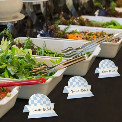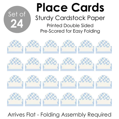 Blue Checkered Party Place Cards INCLUDES 24 individual cards that measure 3.5” wide x 2.5” tall when assembled. Easy to use, these tabletop accents are perfect to use at your next Bridal Shower, Wedding Shower or Birthday Party. VERSATILE IN USE: Whether it’s a small party or large gathering, the Blue and White Place Cards can be used in a variety of ways. Handwrite words in the blank space and then set them on the buffet table, as part of a place setting, or consider using them for an icebreaker activity. EYE-CATCHING DESIGN: Featuring crisp graphics with an innovative cut design, Blue Checkered Party Place Cards will easily draw in attention without taking up too much space. To assemble, push back the top outer edge, revealing the half-circle top. Fold along the pre-scored line in the center to create the tent shape, and then display! HIGH-QUALITY: Checker Place Cards are professionally printed double-sided on sturdy cardstock paper with a photo-like shine. They are individually inspected and carefully packaged by hand. Place Cards will arrive flat with some folding assembly required. MADE IN THE USA: Blue Checkered Party Place Cards are designed and manufactured at our Wisconsin facility using materials that are Made in the USA.