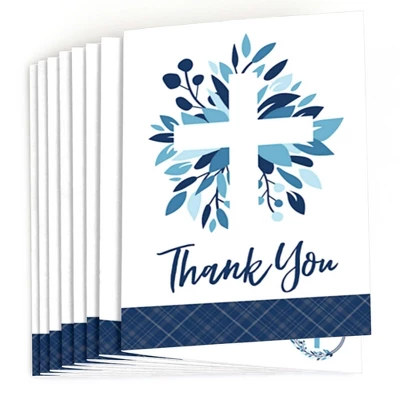 Blue Elegant Cross Thank You Note Card Set INCLUDES 8 boy religious party thank yous and premium white envelopes. Blue Elegant Cross thank you notes are perfect for any event. The cross theme is great for a baptism, Christening, First Communion, Confirmation or baby dedication party. Blue Elegant Cross note cards SIZE 5.5 inches by 3.75 inches, folded. The included envelopes measure 5.75 inches by 3.75 inches. The inside of each Blue Elegant Cross thank you card stationery has a fun graphic as well as space to write a special note to friends and family. PREMIUM THANK YOU CARDS: Blue Elegant Cross thank you cards are professionally printed on heavy-duty card stock paper with a photo-like shine. They are hand-folded and individually inspected, then carefully packaged with our exclusive squiggle flap envelopes, making this boy religious stationary set a must-have for baptism, Christening, First Communion, Confirmation or baby dedication party. MADE IN THE USA: Blue Elegant Cross – Thank You Cards are designed and manufactured at our Wisconsin facility using materials that are Made in the USA.