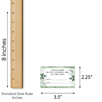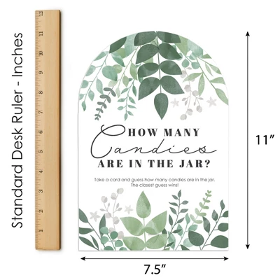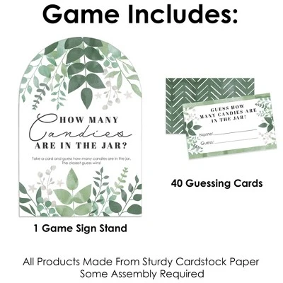 Boho Botanical Candy Guessing Game INCLUDES 1 sign with a built-in stand and 40 guessing cards that will look great at your baby Shower, Bachelorette or Bridal Party. Sign measures 7.5” wide by 11” tall and cards measure 3.5” by 2.25” tall. Candy and jar are not included. HOW TO PLAY: Draw attention to your candy jar with the Boho Botanical Candy Guessing Game! Place the sign and cards next to your candy jar. Guests can then take a card and guess how many candies are in the jar. The closest guess wins! EASY ASSEMBLY: To use, fold the sides of the stand towards the center. Then, fold down the support piece of the stand until it rests in the notches. Finally, display your Greenery sign next to your container of candy. HIGH-QUALITY SUPPLY: Boho Botanical Candy Guessing Game is professionally printed double-sided on sturdy cardstock paper with a photo-like shine. They are individually inspected and then carefully packaged by hand. Sign arrives flat with some easy assembly required. MADE IN THE USA: Boho Botanical Candy Guessing Game is designed and manufactured at our Wisconsin facility using materials that are Made in the USA.