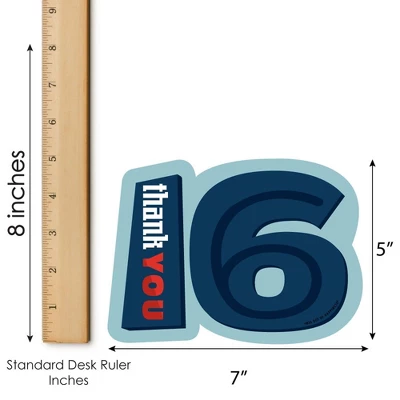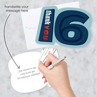 Shaped Thank You Cards Set INCLUDES 12 Boy 16th Birthday party thank you cards and 12 premium white envelopes. 16 Shaped Thank You Cards are the perfect end to any event. #16 party thank you note cards SIZE 7 inches by 5 inches. The included envelopes measure to fit 5 inches by 7 inches cards. The back of each Boy 16th Birthday party thank you has space to write a personal message of thanks. PREMIUM PARTY THANK YOU CARDS: Boy 16th Birthday party thank you cards are professionally printed on heavy-duty cardstock paper with a photo-like shine. They are individually inspected, then carefully packaged with our exclusive squiggle flap envelopes, making this Boy 16th Birthday stationary set a must-have for any sweet sixteen birthday party. MADE IN THE USA: Boy 16th Birthday Party Thank You Cards are designed and manufactured at our Wisconsin facility using materials that are Made in America.