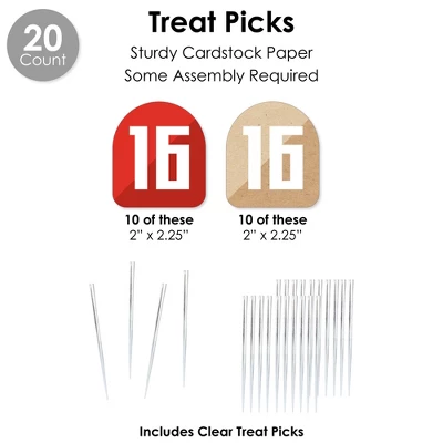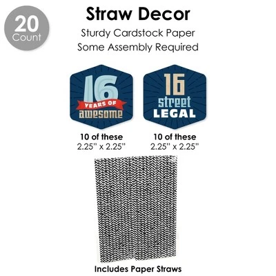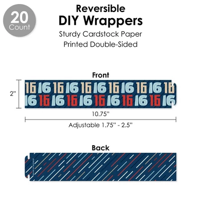DIY WRAPPERS includes: 20 total reversible wrappers that are 10.75″ wide x 2″ tall. When wrapped, they can accommodate favors 1.75″ to 2.5″ in diameter. These wrappers for a Sweet Sixteen Birthday Party are easy to secure on a variety of items! CUPCAKE WRAPPERS includes: 20 adjustable cupcake wrappers 1.75″ – 2.5″ wide x 1.75″ tall. Boy 16th Birthday cupcake wrappers will fit over cupcake liners on standard and medium-sized cupcakes and are reversible for a coordinated look. Secure cupcake wrappers by sliding the tab into appropriate slit. TREAT PICKS includes: 20 cut-outs 2″ wide x 2.25″ tall & clear treat picks 4″ tall. Sweet 16 Themed paper cut-outs come in 2 designs. Assembly stickers are included for easy DIY required assembly. FAVOR GIFT TAGS includes: 20 gift tags 3.5″ wide by 2.75″ tall & satin ribbon. Write a special message on the back side of Boy 16th Birthday gift tags for a personal touch then attach to favors with ribbon. STRAW DECOR includes 20 cut-outs with 2 designs10 of each, size 2.25″ wide by 2.25″ tall and chevron striped paper straws – 7.75″ tall. Shaped cut-outs are professionally printed on sturdy cardstock paper. For easy assembly, create your stylish drinks by attaching Sweet 16 Themed shaped cut-outs to paper straws with clear stickers included. Favor party pack is designed and manufactured at our Wisconsin facility using materials that are Made in the USA. Favor pack uses a No-Mess Glitter Print: Our party kits are designed with a printed image of glitter, eliminating glitter flake while maximizing bling effect!