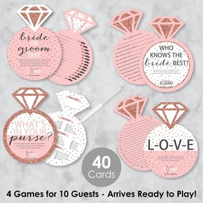 Bride Squad Gamerific Bundle INCLUDES 4 bridal shower or bachelorette games with 10 game cards per each game. BRIDAL SHOWER OR BACHELORETTE GAMES: Guests will have fun playing 4 different bridal shower or bachelorette games: Who Knows the Bride Best, Bride or Groom Quiz, What’s in Your Purse and Love! Each game is shaped like diamond ring. HOW TO PLAY: Each game card is printed with easy-to-follow game instructions. For added fun, make each game extra competitive by adding a time limit and offering a prize to the winning party guest. HIGH-QUALITY: Bride Squad Bridal Shower or Bachelorette Games are professionally printed and double-sided on sturdy cardstock paper. They are individually inspected and carefully packaged by hand. This fun bridal shower or bachelorette game set will arrive ready to play. MADE IN THE USA: Bride Squad Bridal Shower or Bachelorette Gamerific Bundle is designed and manufactured at our Wisconsin facility using materials that are Made in the USA. Bride Squad Game Cards use a No-Mess Glitter Print: Our party games are designed with a printed image of glitter, eliminating glitter flake while maximizing bling effect!