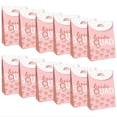 Bride Squad Party Goodie Bag INCLUDES 12 gift favor bags that are perfect for a Bridal Shower or Bachelorette Party. Each bag SIZE measures 4.75” length x 2.5” wide x 7” tall. Party Goodie Bags are excellent for small gifts, treats, and other party favors. FANTASTIC FAVORS: Gather all the goodies to place inside these fun gift bags! Fill the party goodie bags with an assortment of gifts like bite-sized candies, small toys, trinkets, and thank you party favors! Delight your guests when you surprise them with these Bride Squad swag bags. EASY ASSEMBLY: Party goodie bags will arrive flat. Each favor bag includes creased lines and numbered tabs for easy folding. To close each bag, fold over the top flap and secure it by inserting the tab inside the slit. Packaging will also include assembly instructions. HIGH-QUALITY SUPPLY: Pink and Rose Gold Party Goodie Bags are professionally printed double-sided on heavy-duty cardstock paper with a photo-like shine. They are individually inspected and then carefully packaged by hand. MADE IN THE USA: Bride Squad Party Goodie Bags are designed and manufactured at our Wisconsin facility using materials that are Made in the USA. Bride Squad Party Goodie Bags uses a No-Mess Glitter Print: Our Party Goodie Bags are designed with a printed image of glitter, eliminating glitter flake while maximizing bling effect!