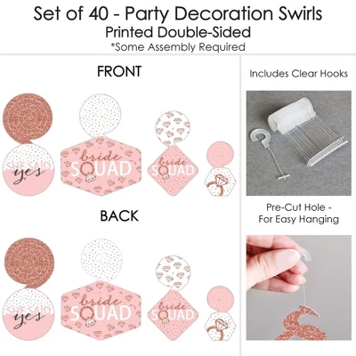 Party Decoration Swirls – Set of 40 INCLUDES 4 different shapes, 10 count per shape, that hang below an accordion-style spiral with included clear hooks. 10 swirls SIZE 5 inches x 5 inches with length about 11 inches. 10 swirls, SIZE 7.75 inches x 5.5 inches with length about 9 inches. 10 swirls, SIZE 5 inches x 4.75 inches with length about 4 inches. 10 swirls, SIZE 3 inches x 2.75 inches with length about 3.5 inches. PERFECT FOR ANY EVENT: With different hanging lengths and a variety of shapes and sizes, Party Decoration Swirls are perfect for bridal shower or bachelorette parties. Add a pop of color when displayed over the gift table or dessert buffet. Or, add your own string if you would like them to hang lower in your party space. EASY TO USE: Each decoration swirl in the 40-piece set has a pre-cut hole for easy assembly using the included clear hooks. Party decoration swirls will arrive flat. Take a clear hook and insert the bottom bar into the pre-cut hole. Once the clear hook is fastened, gently stretch the swirl and hang it up. HIGH-QUALITY PARTY SUPPLY: Bride Squad Party Decoration Swirls are professionally printed and double-sided on heavy-duty cardstock paper. They are individually cut, inspected, and carefully packaged. Each swirl will use one clear hook. MADE IN THE USA: Party Decoration Swirls are designed and manufactured at our Wisconsin facility using materials that are Made in the USA. Bride Squad Party Decoration Swirls uses a No-Mess Glitter Print: Our party kits are designed with a printed image of glitter, eliminating glitter flake while maximizing bling effect!