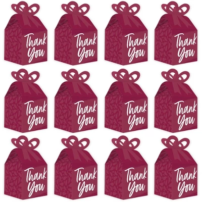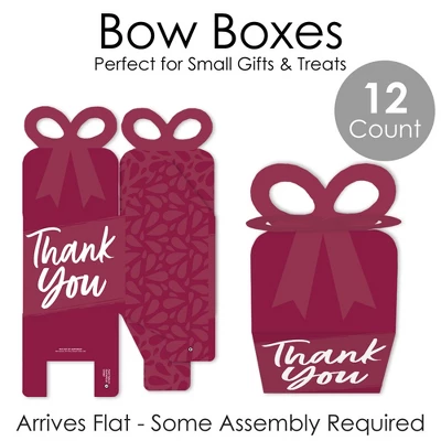 Bow Boxes INCLUDE: 12 Burgundy Elegantly Simple-themed square favor gift boxes. Each box SIZE measures 3.5 inches length x 3.5 inches width x 7 inches height. Bow boxes are ideal for small gifts and treats that are under 3.5 inches tall (height for storing items in closed box). When assembled and closed, each box creates a 3D paper bow-shaped top with a square bottom. CUTE GIFT BOXES: This small, closed favor box can be filled with homemade treats (fun cupcake box), party trinkets, or thank you gifts. At the party, have each guest fill their Red Wine-Colored bow box with snacks from a candy buffet or use as a party loot box. Guests will have fun guessing what surprise each favor gift box contains. PREMIUM PARTY SUPPLY: Bow boxes are professionally printed and double-sided on heavy-duty cardstock paper, with a photo-like shine. They are hand-folded, individually inspected, and then carefully packaged. EASY ASSEMBLY: Burgundy Elegantly Simple bow boxes will arrive flat. Each bow box has crease lines and numbered tabs for easy folding. Finish the DIY assembly by interlocking top of box to create a three-dimensional bow. Packaging will include assembly instructions. MADE IN THE USA: Red Wine-Colored Baby or Bridal Shower, Anniversary, Retirement, or Birthday Party bow boxes are designed and manufactured at our Wisconsin facility using materials that are Made in the USA.