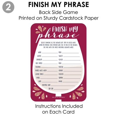 Big Dot of Happiness But First, Wine Activity Duo Games INCLUDES set of 20 Wine Tasting Party activity cards. Each card comes with 2 different games – 1 game per side. Instructions and answer keys included on each card. Festive Fun: Add some entertainment to your celebration when you pass out the 2-in-1 But First, Wine activity cards. Each card is easy to handwrite on and features games What’s On Your Phone? and Finish My Phrase. How To Play: Each game card is printed with easy-to-follow game instructions and requires a pen or pencil. For added fun, make each game competitive by adding a time limit and offering a prize to the winning party guest. High-Quality Supply: But First, Wine cards are professionally printed double-sided on heavy-duty cardstock paper with a photo-like shine. Each Rectangle-shaped card measures 5″ wide by 7″ tall. This game set will arrive ready to play. Made In The USA: But First, Wine Activity Duo Games are designed and manufactured at our Wisconsin facility using materials that are Made in the USA. But First, Wine Activity Cards uses a No-Mess Glitter Print: Our cards are designed with a printed image of glitter, eliminating glitter flake while maximizing bling effect!