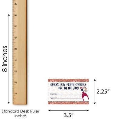 But First, Wine Candy Guessing Game INCLUDES 1 sign with a built-in stand and 40 guessing cards that will look great at your Bridal Shower, Bachelorette or Birthday Party. Sign measures 7.5” wide by 11” tall and cards measure 3.5” by 2.25” tall. Candy and jar are not included. HOW TO PLAY: Draw attention to your candy jar with the But First, Wine Candy Guessing Game! Place the sign and cards next to your candy jar. Guests can then take a card and guess how many candies are in the jar. The closest guess wins! EASY ASSEMBLY: To use, fold the sides of the stand towards the center. Then, fold down the support piece of the stand until it rests in the notches. Finally, display your Wine Tasting sign next to your container of candy. HIGH-QUALITY SUPPLY: But First, Wine Candy Guessing Game is professionally printed double-sided on sturdy cardstock paper with a photo-like shine. They are individually inspected and then carefully packaged by hand. Sign arrives flat with some easy assembly required. MADE IN THE USA: But First, Wine Candy Guessing Game is designed and manufactured at our Wisconsin facility using materials that are Made in the USA. But First, Wine Candy Guessing Games uses a No-Mess Glitter Print: Our signs and cards are designed with a printed image of glitter, eliminating glitter flake while maximizing bling effect!