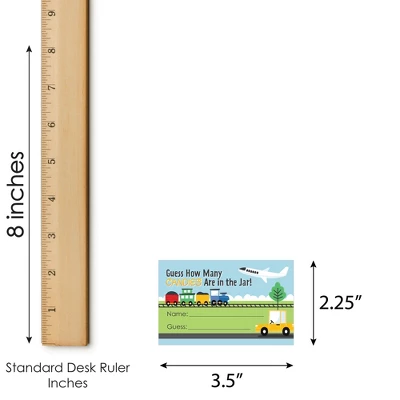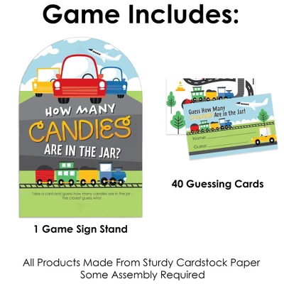 Cars, Trains, and Airplanes Candy Guessing Game INCLUDES 1 sign with a built-in stand and 40 guessing cards that will look great at your Birthday Party. Sign measures 7.5” wide by 11” tall and cards measure 3.5” by 2.25” tall. Candy and jar are not included. HOW TO PLAY: Draw attention to your candy jar with the Cars, Trains, and Airplanes Candy Guessing Game! Place the sign and cards next to your candy jar. Guests can then take a card and guess how many candies are in the jar. The closest guess wins! EASY ASSEMBLY: To use, fold the sides of the stand towards the center. Then, fold down the support piece of the stand until it rests in the notches. Finally, display your Transportation sign next to your container of candy. HIGH-QUALITY SUPPLY: Cars, Trains, and Airplanes Candy Guessing Game is professionally printed double-sided on sturdy cardstock paper with a photo-like shine. They are individually inspected and then carefully packaged by hand. Sign arrives flat with some easy assembly required. MADE IN THE USA: Cars, Trains, and Airplanes Candy Guessing Game is designed and manufactured at our Wisconsin facility using materials that are Made in the USA.