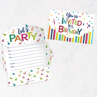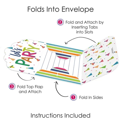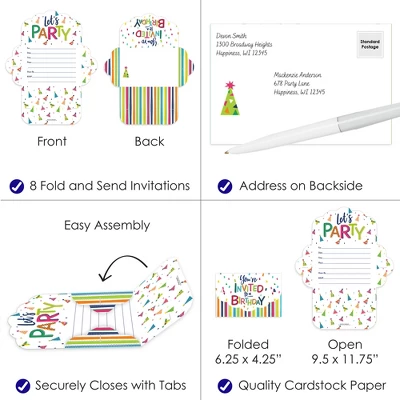 Cheerful Happy Birthday Fold and Send Invitations includes a set of 8 Birthday Party invitations. This all-in-one set of invites can be folded into an envelope and comes with clear stickers for secure delivery. Splendid Surprise: Excite your partygoers with these unique and charming invites that turn into envelopes. Colorful invitations include fill-in-the-blank space to add your party details. Once assembled, you can directly hand the invites to your recipients or write out the address information on the backside and send your invite via snail mail. Easy Assembly: To transform your invite into an envelope, begin by folding the sides inward. Next, fold and attach the bottom flap by inserting the tabs into the slots of the side flaps. Finally, fold the top flap over and insert its tabs into the slots. Seal your envelope shut using a clear sticker. Practice assembling using the instruction card included. Premium Party Supply: Cheerful Happy Birthday party invitations are professionally printed double-sided on quality cardstock paper with a photo-like shine. When folded, invite cards measure 6.25 inches wide x 4.25 inches tall, and when open, cards measure 9.5 inches wide x 11.75 inches tall. Made In The USA: Colorful Fold and Send Invitations are designed and manufactured at our Wisconsin facility using materials that are Made in the USA.