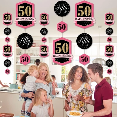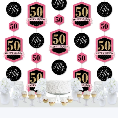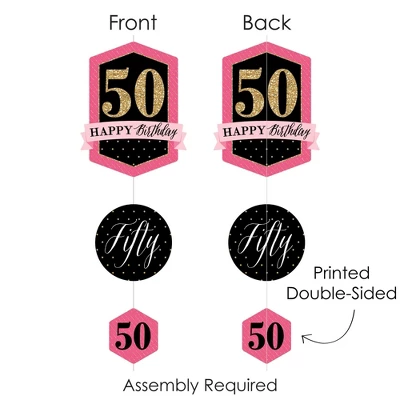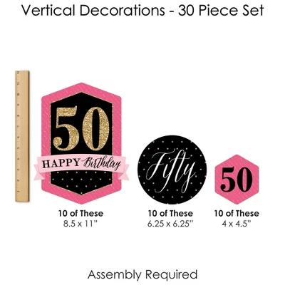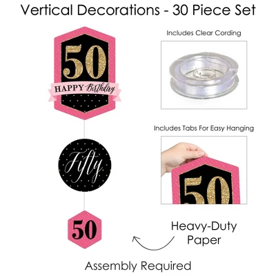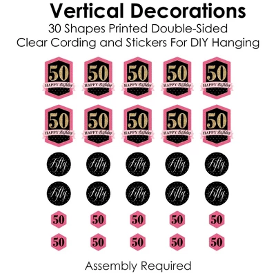 Chic 50th Birthday – Pink, Black and Gold Hanging Vertical Decorations INCLUDE 30 shaped pieces, 1 roll clear cording, and assembly stickers. Chic 50th Birthday – Pink, Black and Gold Vertical Decorations are fun and versatile party danglers for your next Birthday Party. ROOMERIFIC: Chic 50th Birthday – Pink, Black and Gold Hanging Vertical Decorations can be displayed at any lengths you choose and make an attractive backdrop for your next Birthday Party. Shaped pieces come in 3 sizes of 10 each, with the following specifications: 10 at 8.5 x 11 inches, 10 at 6.25 x 6.25 inches, and 10 at 4 x 4.5 inches. Hang near a wall to capture fun group photos, or place throughout the room to create a unified theme. DIY DONE RIGHT: Get ready for guests in a snap with this colorful, easy-to-assemble, 30-piece Chic 50th Birthday – Pink, Black and Gold Hanging Party Decorations kit. Printed double-sided, each shaped piece includes top and bottom tabs for easy hanging. Simply interlock clear cording into each piece and secure with provided clear stickers. HIGH-QUALITY DECOR: Chic 50th Birthday – Pink, Black and Gold Hanging Vertical Decorations are professionally printed on heavy-duty cardstock paper. Each piece is individually inspected and carefully packaged by hand. Requires some simple do-it-yourself assembly. Use provided clear cording to display decorations however you prefer. MADE IN THE USA: Chic 50th Birthday – Pink, Black and Gold Hanging Vertical Decorations are designed and manufactured at our Wisconsin facility using materials that are Made in the USA. Chic 50th Birthday – Pink, Black and Gold Hanging Vertical Decorations use a No-Mess Glitter Print: Our Vertical Decorations are designed with a printed image of glitter, eliminating glitter flake while maximizing bling effect!