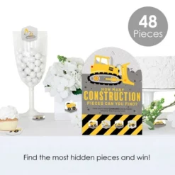 Dig It Hide and Find Game INCLUDES 1 sign with a built-in stand and 48 hexagon game pieces that you can hide for an exhilarating scavenger hunt at your Birthday Party or Baby Shower. Easy Assembly: Dig It game sign comes with built-in stand and requires some easy DIY assembly. To display your sign, fold the sides of the stand towards the center. Then, fold down the support piece of the stand until it rests in the notches. How To Play: Hide and find game sign shows the design of each hexagon piece, so display on a table where everyone can see. Then, find creative places to hide the game pieces around your venue. Finally, send your guests to hunt for the pieces. Whoever finds the most pieces wins! For a twist, divide the guests into teams and assign each team a piece to hunt for. High-Quality Supply: Construction Party Zone Themed Hide and Find Game is professionally printed double-sided on heavy-duty cardstock paper with a photo-like shine. Sign measures 7.5” wide by 11” tall and hexagon pieces measure 2.25” wide by 2.25” tall. Made In The USA: Dig It Hide and Find Game is designed and manufactured at our Wisconsin facility using materials that are Made in the USA.