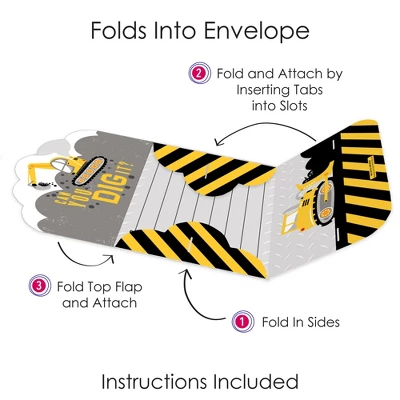 Dig It – Construction Party Zone Fold and Send Invitations includes a set of 8 Baby Shower or Birthday Party invitations. This all-in-one set of invites can be folded into an envelope and comes with clear stickers for secure delivery. Splendid Surprise: Excite your partygoers with these unique and charming invites that turn into envelopes. Dump Truck invitations include fill-in-the-blank space to add your party details. Once assembled, you can directly hand the invites to your recipients or write out the address information on the backside and send your invite via snail mail. Easy Assembly: To transform your invite into an envelope, begin by folding the sides inward. Next, fold and attach the bottom flap by inserting the tabs into the slots of the side flaps. Finally, fold the top flap over and insert its tabs into the slots. Seal your envelope shut using a clear sticker. Practice assembling using the instruction card included. Premium Party Supply: Dig It – Construction Party Zone party invitations are professionally printed double-sided on quality cardstock paper with a photo-like shine. When folded, invite cards measure 6.25 inches wide x 4.25 inches tall, and when open, cards measure 9.5 inches wide x 11.75 inches tall. Made In The USA: Dump Truck Fold and Send Invitations are designed and manufactured at our Wisconsin facility using materials that are Made in the USA.