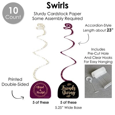 SWIRLS includes: 10 total swirls with 2 designs – 5 count per design, that hang with an accordion-style spiral. Professionally printed double-sided, the Elegant Thankful for Friends decoration swirls come with a 5.25” wide base and a spiral length of about 23” long. Each decoration swirl comes with a pre-cut hole and clear hooks for easy assembly. BUNTING BANNER includes: letter and themed pennants, perfect for your Floral & Striped Friendsgiving Thanksgiving Party. Each pennant measures 5” wide x 7.25” tall. Pennants are numbered in sequence and ribbon is included for easy assembly. TABLE TOPPERS includes: 10 centerpiece sticks that come with two shape cut-out designs, each professionally printed double-sided. The centerpiece shapes measure 7.5” wide x 5” tall. To use as centerpieces or photo props for your Friendsgiving Thanksgiving Party, assembly stickers are included for the easy DIY required assembly. CIRCLE CONFETTI includes: 30 paper circles with 2 different sizes – 10 large circles, size 3.5” and 20 small circles, size 2.75”. Professionally printed double-sided, the Elegant Thankful for Friends circle confetti can be placed flipped over for added variety. Scatter around your table for a delightful accent. MADE IN THE USA: Elegant Thankful for Friends Decor Galore Party Pack is designed and manufactured at our Wisconsin facility using materials that are Made in the USA.