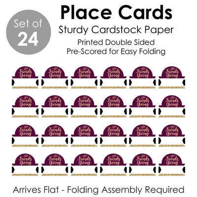Elegant Thankful for Friends Place Cards INCLUDES 24 individual cards that measure 3.5” wide x 2.5” tall when assembled. Easy to use, these tabletop accents are perfect to use at your next Friendsgiving Thanksgiving Party. VERSATILE IN USE: Whether it’s a small party or large gathering, the Place Cards can be used in a variety of ways. Handwrite words in the blank space and then set them on the buffet table, as part of a place setting, or consider using them for an icebreaker activity. EYE-CATCHING DESIGN: Featuring crisp graphics with an innovative cut design, Elegant Thankful for Friends Place Cards will easily draw in attention without taking up too much space. To assemble, push back the top outer edge, revealing the half-circle top. Fold along the pre-scored line in the center to create the tent shape, and then display! HIGH-QUALITY: Purple & Gold Place Cards are professionally printed double-sided on sturdy cardstock paper with a photo-like shine. They are individually inspected and carefully packaged by hand. Place Cards will arrive flat with some folding assembly required. MADE IN THE USA: Elegant Thankful for Friends Place Cards are designed and manufactured at our Wisconsin facility using materials that are Made in the USA. Elegant Thankful for Friends Place Cards uses a No-Mess Glitter Print: Our Place Cards are designed with a printed image of glitter, eliminating glitter flake while maximizing bling effect!