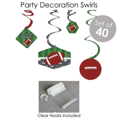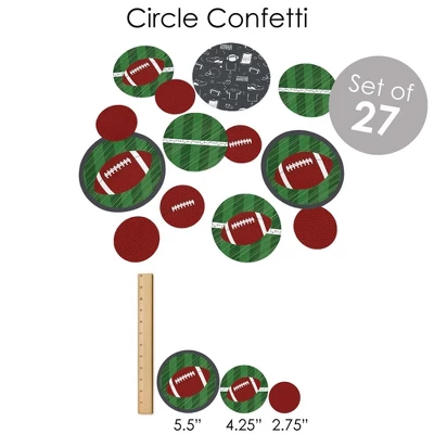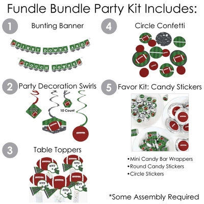 BUNTING BANNER includes: letter and themed pennants. Each pennant measures 8.5″ high x 5.5″ wide. Pennants are numbered in sequence and ribbon is included for easy assembly. PARTY DECORATION SWIRLS includes: 4 different shapes, 10 count per shape, that hang below an accordion-style spiral. Professionally printed double-sided, each decoration swirl in the 40-piece set has a pre-cut hole for easy assembly using the included clear hooks. Party decoration swirls will arrive flat. TABLE TOPPERS includes: 15 End Zone – Football centerpiece sticks in three different shapes, each professionally printed double-sided. To use as centerpieces or photo props, wooden dowels and assembly stickers are included. CIRCLE CONFETTI includes: three different sizes of circles – 12 small circles, size 2.75″, 9 medium circles, size 4.25″, and 6 large circles, size 5.5″. Professionally printed double-sided with coordinating football designs, circle confetti can be scattered around your table. FAVOR KIT: CANDY STICKERS includes: 2 sheets mini candy bar wrappers (total 40), 2 sheets round candy stickers (total 216), 2 sheets circle stickers (total 48). Easy assembly with this peel and stick favor kit. Simply center and press stickers onto your favorite candies to style candy buffets or decorate take-home favors for party guests. Note: Candy is not included.