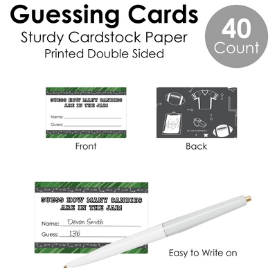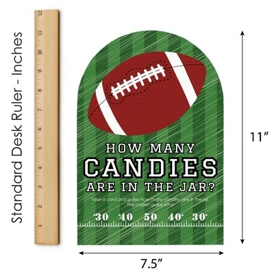 End Zone – Football Candy Guessing Game INCLUDES 1 sign with a built-in stand and 40 guessing cards that will look great at your Baby Shower or Birthday Party. Sign measures 7.5” wide by 11” tall and cards measure 3.5” by 2.25” tall. Candy and jar are not included. HOW TO PLAY: Draw attention to your candy jar with the End Zone – Football Candy Guessing Game! Place the sign and cards next to your candy jar. Guests can then take a card and guess how many candies are in the jar. The closest guess wins! EASY ASSEMBLY: To use, fold the sides of the stand towards the center. Then, fold down the support piece of the stand until it rests in the notches. Finally, display your Sports sign next to your container of candy. HIGH-QUALITY SUPPLY: End Zone – Football Candy Guessing Game is professionally printed double-sided on sturdy cardstock paper with a photo-like shine. They are individually inspected and then carefully packaged by hand. Sign arrives flat with some easy assembly required. MADE IN THE USA: End Zone – Football Candy Guessing Game is designed and manufactured at our Wisconsin facility using materials that are Made in the USA.