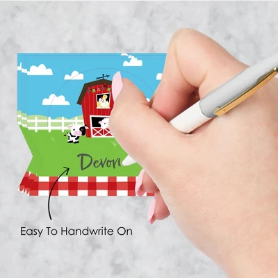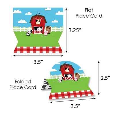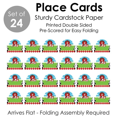 Farm Animals Place Cards INCLUDES 24 individual cards that measure 3.5” wide x 2.5” tall when assembled. Easy to use, these tabletop accents are perfect to use at your next Barnyard Baby Shower or Birthday Party. VERSATILE IN USE: Whether it’s a small party or large gathering, the Barnyard Bash Place Cards can be used in a variety of ways. Handwrite words in the blank space and then set them on the buffet table, as part of a place setting, or consider using them for an icebreaker activity. EYE-CATCHING DESIGN: Featuring crisp graphics with an innovative cut design, Farm Animals Place Cards will easily draw in attention without taking up too much space. To assemble, push back the top outer edge, revealing the half-circle top. Fold along the pre-scored line in the center to create the tent shape, and then display! HIGH-QUALITY: Barnyard Bash Place Cards are professionally printed double-sided on sturdy cardstock paper with a photo-like shine. They are individually inspected and carefully packaged by hand. Place Cards will arrive flat with some folding assembly required. MADE IN THE USA: Farm Animals Place Cards are designed and manufactured at our Wisconsin facility using materials that are Made in the USA.