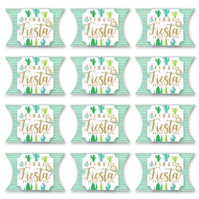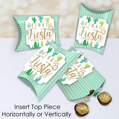 Final Fiesta Large Pillow Boxes INCLUDES 12 boxes and 12 decorative top pieces. Boxes arrive flat and require some easy assembly. These Cactus favor gift boxes make great giveaways at your next Bridal Shower or Bachelorette Party. BOX-ERRIFIC: Final Fiesta Large Pillow Boxes are SIZE 7 inches long x 4.5 inches wide. Fully assembled boxes have a 1.75-inch-wide opening on both ends and are 5 inches deep for storing items inside. Made of heavy-duty, these loot favor gift boxes can be filled with wrapped treats, trinkets, or small mementos; boxes are suitable for all ages. These boxes are fun and artful, making them perfect accents at any party table setting. EASY ASSEMBLY: Last Fiesta Large Pillow Boxes require some assembly before use. Start by securing a top piece to a pillow box by tucking top piece under both tabs on box. Gently squeeze box open and fold ends down in numerical order. NOTE: Top pieces can be displayed horizontally or vertically on boxes. PREMIUM FAVOR BOXES: Mexican Fiesta Bachelorette Party Large Pillow Boxes are professionally printed on heavy-duty paper with a photo-like shine. The ends have full overlapping flaps; no tape or extra materials needed. They are individually inspected and carefully packaged. Treats, trinkets, and small mementos not included. MADE IN THE USA: Final Fiesta Large Pillow Boxes are designed and manufactured at our Wisconsin facility using materials that are Made in the USA. Final Fiesta Large Pillow Boxes use a No-Mess Glitter Print: Our Pillow Boxes are designed with a printed image of glitter, eliminating glitter flake while maximizing bling effect!