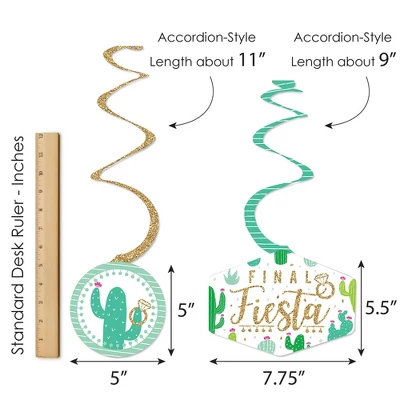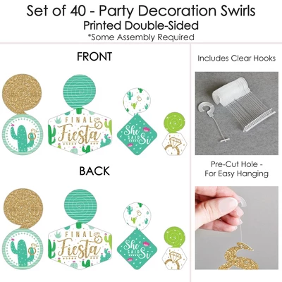 Party Decoration Swirls – Set of 40 INCLUDES 4 different shapes, 10 count per shape, that hang below an accordion-style spiral with included clear hooks. 10 swirls SIZE 5 inches x 5 inches with length about 11 inches. 10 swirls, SIZE 7.75 inches x 5.5 inches with length about 9 inches. 10 swirls, SIZE 5 inches x 4.75 inches with length about 4 inches. 10 swirls, SIZE 3 inches x 2.75 inches with length about 3.5 inches. PERFECT FOR ANY EVENT: With different hanging lengths and a variety of shapes and sizes, Party Decoration Swirls are perfect for last fiesta bachelorette parties. Add a pop of color when displayed over the gift table or dessert buffet. Or, add your own string if you would like them to hang lower in your party space. EASY TO USE: Each decoration swirl in the 40-piece set has a pre-cut hole for easy assembly using the included clear hooks. Party decoration swirls will arrive flat. Take a clear hook and insert the bottom bar into the pre-cut hole. Once the clear hook is fastened, gently stretch the swirl and hang it up. HIGH-QUALITY PARTY SUPPLY: Final Fiesta Party Decoration Swirls are professionally printed and double-sided on heavy-duty cardstock paper. They are individually cut, inspected, and carefully packaged. Each swirl will use one clear hook. MADE IN THE USA: Party Decoration Swirls are designed and manufactured at our Wisconsin facility using materials that are Made in the USA. Final Fiesta Party Decoration Swirls uses a No-Mess Glitter Print: Our party kits are designed with a printed image of glitter, eliminating glitter flake while maximizing bling effect!