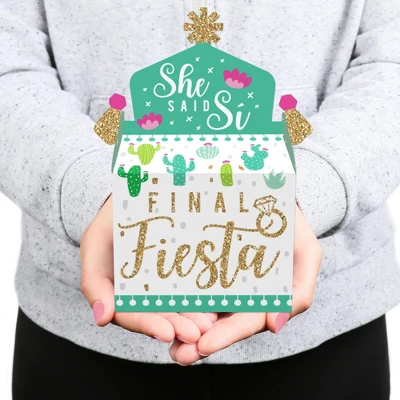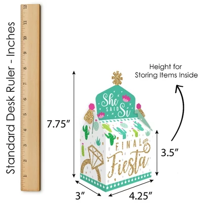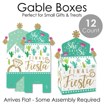 Gable Boxes INCLUDE: 12 Final Fiesta-themed goodie party favor boxes. Each box SIZE measures 4.25 inches length x 3 inches width x 7.75 inches height. Gable favor boxes are ideal for small gifts and treats that are under 3.5 inches tall (height for storing items in closed box). FUN PARTY FAVORS: Use gable boxes for a unique party gift at any celebration party. This small, closed favor box can be filled with baked goodies, party trinkets, or thank you gifts. Party guests will have fun with the mystery of what each party loot box will contain. PREMIUM PARTY SUPPLY: Gable treat boxes are professionally printed and double-sided on heavy-duty cardstock paper, with a photo-like shine. They are hand-folded, individually inspected, and then carefully packaged. SIMPLE ASSEMBLY: Final Fiesta gable boxes will arrive flat. Allow time for the required assembly of each box. Gable boxes have crease lines and numbered tabs for easy folding. Packaging will include assembly instructions. MADE IN THE USA: Final Fiesta Bachelorette Party goodie gable boxes are designed and manufactured at our Wisconsin facility using materials that are Made in the USA. Final Fiesta goodie gable boxes use a No-Mess Glitter Print: Our DIY party decorations are designed with a printed image of glitter, eliminating glitter flake while maximizing bling effect!