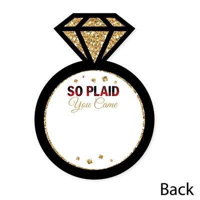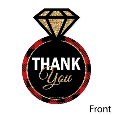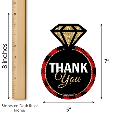 Shaped Thank You Cards Set INCLUDES: 12 Flannel Fling Before the Ring buffalo plaid bachelorette party thank you cards and 12 premium white envelopes. Ring Shaped Thank You Cards are the perfect end to any event. Ring thank you note cards SIZE 5 inches by 7 inches. The included envelopes measure to fit 5 inches by 7 inches cards. The back of each Flannel Fling Before the Ring buffalo plaid bachelorette party thank you has space to write a personal message of thanks. PREMIUM PARTY THANK YOU CARDS: Flannel Fling Before the Ring party thank you cards are professionally printed on heavy-duty cardstock paper with a photo-like shine. They are individually inspected, then carefully packaged with our exclusive squiggle flap envelopes, making this Flannel Fling Before the Ring stationary set a must-have for any buffalo plaid bachelorette party. MADE IN THE USA: Flannel Fling Before the Ring Party Thank You Cards are designed and manufactured at our Wisconsin facility using materials that are Made in America. Flannel Fling Before the Ring Thank You Cards use a No-Mess Glitter Print: Our invitations are designed with a printed image of glitter, eliminating glitter flake while maximizing bling effect!