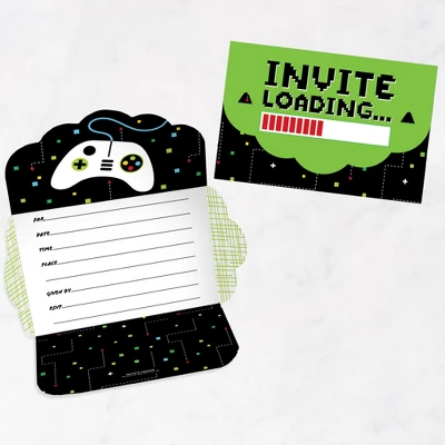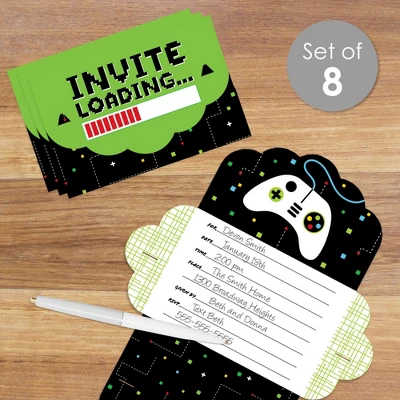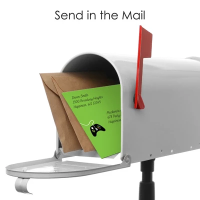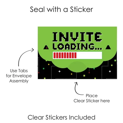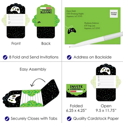 Game Zone Fold and Send Invitations includes a set of 8 Pixel Video Game Party or Birthday Party invitations. This all-in-one set of invites can be folded into an envelope and comes with clear stickers for secure delivery. Splendid Surprise: Excite your partygoers with these unique and charming invites that turn into envelopes. Black and Green Pixel invitations include fill-in-the-blank space to add your party details. Once assembled, you can directly hand the invites to your recipients or write out the address information on the backside and send your invite via snail mail. Easy Assembly: To transform your invite into an envelope, begin by folding the sides inward. Next, fold and attach the bottom flap by inserting the tabs into the slots of the side flaps. Finally, fold the top flap over and insert its tabs into the slots. Seal your envelope shut using a clear sticker. Practice assembling using the instruction card included. Premium Party Supply: Game Zone party invitations are professionally printed double-sided on quality cardstock paper with a photo-like shine. When folded, invite cards measure 6.25 inches wide x 4.25 inches tall, and when open, cards measure 9.5 inches wide x 11.75 inches tall. Made In The USA: Black and Green Pixel Fold and Send Invitations are designed and manufactured at our Wisconsin facility using materials that are Made in the USA.
