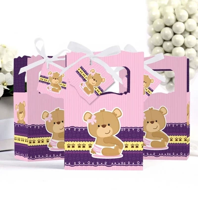 Girl Baby Teddy Bear Favor Boxes INCLUDES 12 girl teddy bear party favor bags, 12 gift tags and coordinating satin ribbon. Classic favor boxes are a party must-have. Pink teddy bear theme party supplies are great for a baby shower or birthday party. Girl Baby Teddy Bear Party Favor Boxes SIZE 4.75 inches wide x 4.75 inches high x 2.25 inches deep (fillable inside space) with a total height of 7 inches, including the handle. The coordinating gift tags and ribbon makes these pink, purple, and brown teddy bear party favor boxes a complete treat bag party kit that everyone will love. PARTY SUPPLIES: Baby shower or birthday party favor boxes will hold a variety of treats, prizes and party favors for your guests. Fill them with baked goodies, party trinkets or thank you gifts for adorable Girl Baby Teddy Bear party favors! PREMIUM PARTY FAVOR BOXES: Girl Baby Teddy Bear party favor boxes are professionally printed on heavy-duty cardstock paper with a photo-like shine. They are hand-folded and individually inspected, then carefully packaged. Favor boxes will arrive flat, partially assembled. Finishing assembly is required but it is easy. Once assembled, add the pink, purple, and brown teddy bear gift tag with the included ribbon for perfect party favors! MADE IN AMERICA: Girl Baby Teddy Bear – Baby Shower or Birthday Party Favor Boxes are designed and manufactured at our Wisconsin facility using materials that are Made in America.